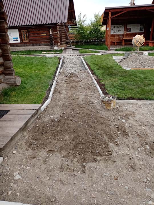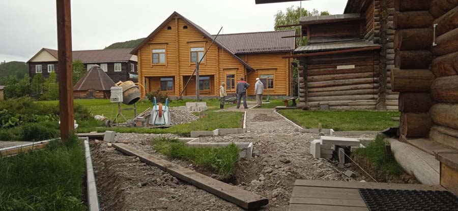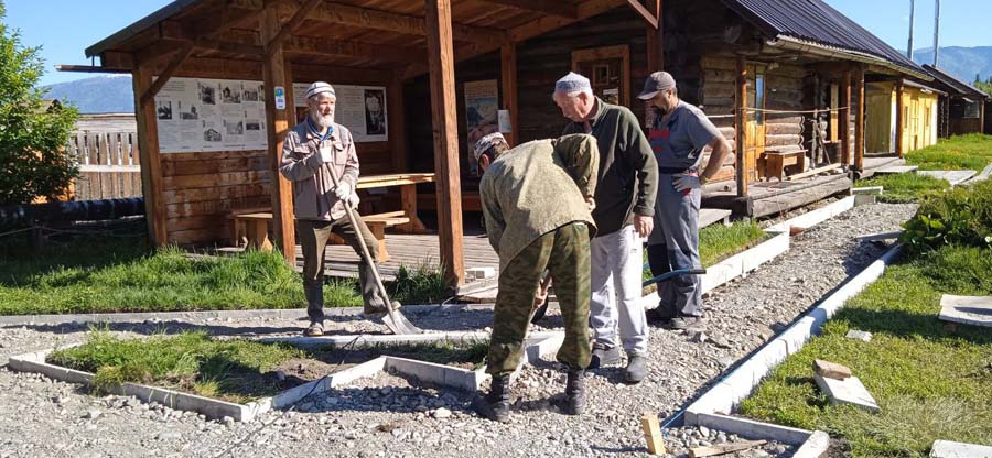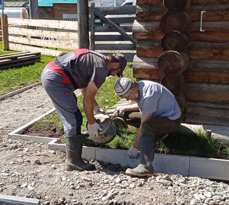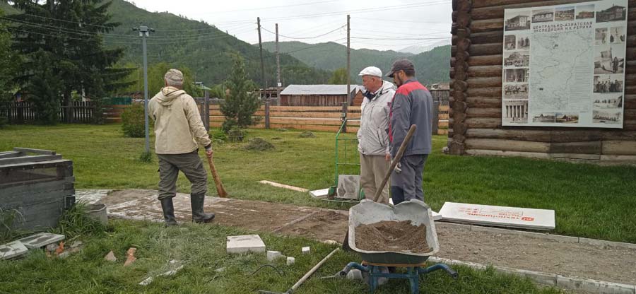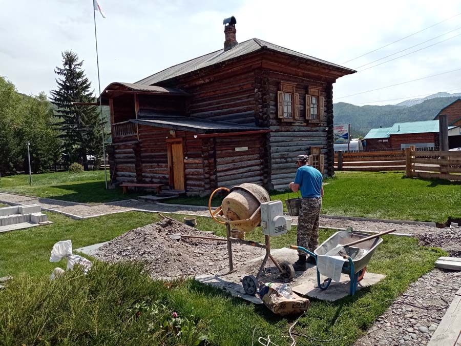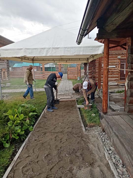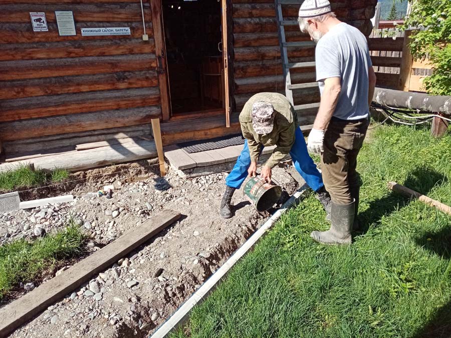 27 мая на территории Мемориального дома-музея Н.К. Рериха в селе Верх-Уймон сотрудники завершили укладку тротуарных плиток. Прежние деревянные мостки уже потеряли своё качество и, кроме того, не обеспечивали безопасность — при дожде и наледи ходить по ним было очень скользко. Сейчас удобные пешеходные дорожки соединяют музей, новый выставочный зал, флигель, в котором находится книжный киоск, и служебное помещение для экскурсоводов. Около месяца экскурсоводы имели возможность наблюдать все этапы дружной работы сотрудников и помощников музея по прокладыванию дорожек. Этому предшествовали выполненные в 2024 году земляные работы, обозначившие контуры будущего тротуара, также была произведена отсыпка щебнем. Работы в мае начались с бетонирования оснований под бордюры. Для приготовления бетона на строительную площадку на тележке подвозили щебень. После бетонирования началась установка тротуарных бордюров. Затем в ход снова пошла тележка, на которой доставляли песок для планировки основания под тротуарную плитку. Перед этим песок просеивался на сконструированной самодельной установке. Завершилось всё длительным и трудоёмким процессом — укладкой самой плитки. Все работы выполнялись вручную, единственным помощником на стройке была бетономешалка. Чтобы подогнать и плотно уложить тротуарную плитку, часто приходилось её пилить, и тогда над строительной площадкой поднимались клубы каменной пыли. Распиливали также и бордюры, которые заранее были изготовлены в мастерской музея. Погода в мае была разная, поэтому приходилось работать и под палящим солнцем, и во время дождя, под тут же сооружённым навесом. На каком-то этапе, чтобы не снизилась работоспособность и не нарушились строительные сроки, даже заговорили о научной организации труда. Следует отдельно сказать о тротуарной плитке — она была изготовлена заранее собственными силами и по собственной технологии. Традиционная основа из цемента, песка и воды была украшена местным сланцем. Это было не только эстетическое, но и функциональное решение. Камень придал плитке дополнительную прочность и устойчивость, а его фактура и цвет создали особый декоративный эффект. Каждая плитка — неповторима, у каждой свой каменный узор. В мае на стройке, кроме сотрудников СибРО Андрея Ломакина, Александра Садового и Виктора Пенькова, трудились друзья из Ярославля и Уфы: Евгений Бушуев, Алексей Коршунов, Владимир Лисин и Гумер Трегулов. Все работы курировал главный инженер СибРО Игорь Щербаков. Эта дружная бригада достойна самого глубокого уважения и благодарности за самоотверженный труд, готовность выполнять любую работу и решать сложные задачи.