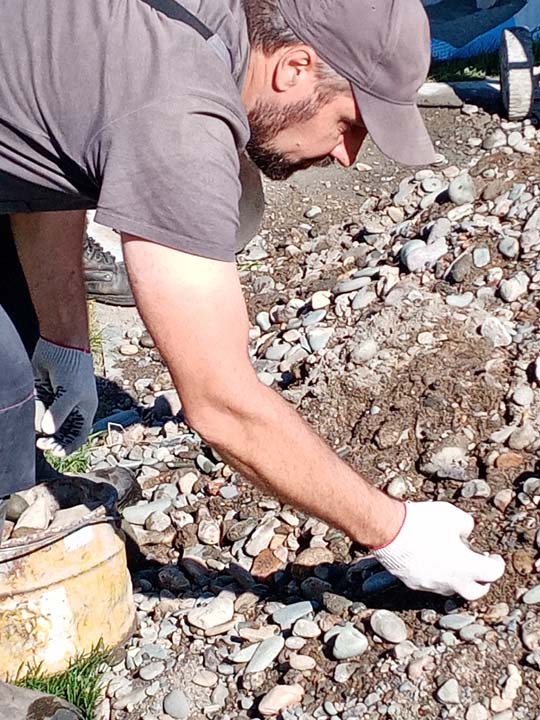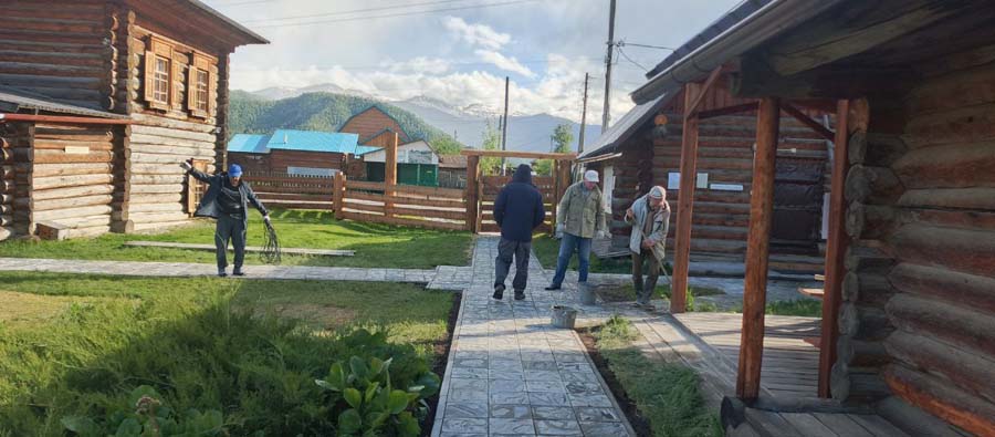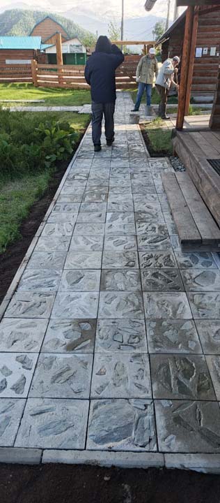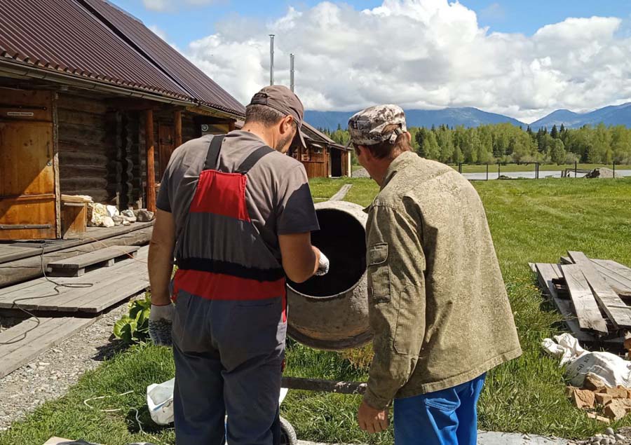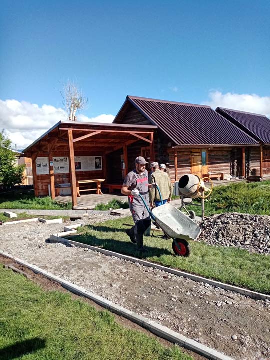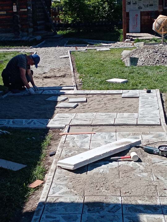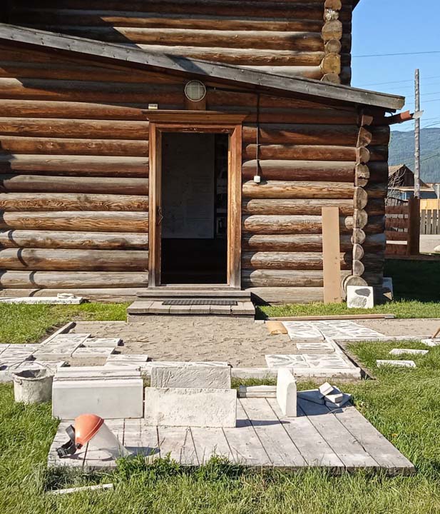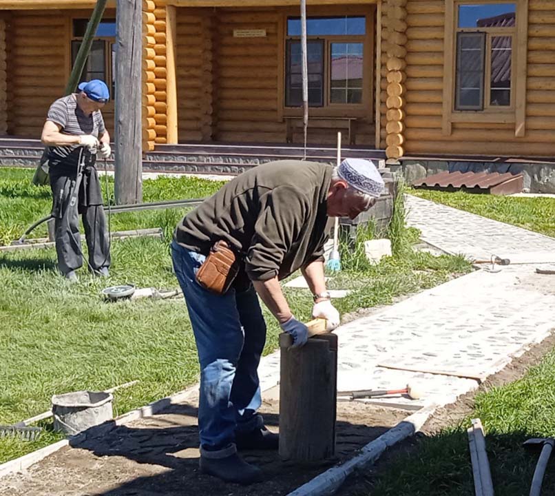 27 мая на территории Мемориального дома-музея Н.К. Рериха в селе Верх-Уймон сотрудники завершили укладку тротуарных плиток. Прежние деревянные мостки уже потеряли своё качество и, кроме того, не обеспечивали безопасность — при дожде и наледи ходить по ним было очень скользко. Сейчас удобные пешеходные дорожки соединяют музей, новый выставочный зал, флигель, в котором находится книжный киоск, и служебное помещение для экскурсоводов. Около месяца экскурсоводы имели возможность наблюдать все этапы дружной работы сотрудников и помощников музея по прокладыванию дорожек. Этому предшествовали выполненные в 2024 году земляные работы, обозначившие контуры будущего тротуара, также была произведена отсыпка щебнем. Работы в мае начались с бетонирования оснований под бордюры. Для приготовления бетона на строительную площадку на тележке подвозили щебень. После бетонирования началась установка тротуарных бордюров. Затем в ход снова пошла тележка, на которой доставляли песок для планировки основания под тротуарную плитку. Перед этим песок просеивался на сконструированной самодельной установке. Завершилось всё длительным и трудоёмким процессом — укладкой самой плитки. Все работы выполнялись вручную, единственным помощником на стройке была бетономешалка. Чтобы подогнать и плотно уложить тротуарную плитку, часто приходилось её пилить, и тогда над строительной площадкой поднимались клубы каменной пыли. Распиливали также и бордюры, которые заранее были изготовлены в мастерской музея. Погода в мае была разная, поэтому приходилось работать и под палящим солнцем, и во время дождя, под тут же сооружённым навесом. На каком-то этапе, чтобы не снизилась работоспособность и не нарушились строительные сроки, даже заговорили о научной организации труда. Следует отдельно сказать о тротуарной плитке — она была изготовлена заранее собственными силами и по собственной технологии. Традиционная основа из цемента, песка и воды была украшена местным сланцем. Это было не только эстетическое, но и функциональное решение. Камень придал плитке дополнительную прочность и устойчивость, а его фактура и цвет создали особый декоративный эффект. Каждая плитка — неповторима, у каждой свой каменный узор. В мае на стройке, кроме сотрудников СибРО Андрея Ломакина, Александра Садового и Виктора Пенькова, трудились друзья из Ярославля и Уфы: Евгений Бушуев, Алексей Коршунов, Владимир Лисин и Гумер Трегулов. Все работы курировал главный инженер СибРО Игорь Щербаков. Эта дружная бригада достойна самого глубокого уважения и благодарности за самоотверженный труд, готовность выполнять любую работу и решать сложные задачи.